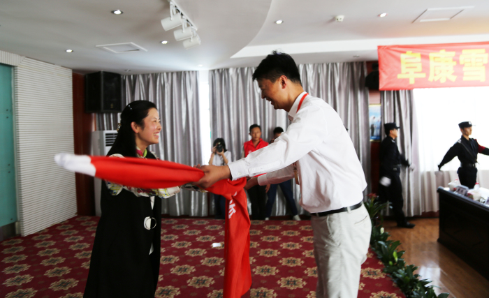 西藏志愿服務(wù)聯(lián)合會(huì)副秘書長(zhǎng)為阜康雪域天使志愿者服務(wù)隊(duì)授予隊(duì)旗