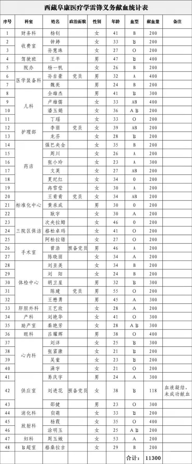 本次學(xué)雷鋒無償獻血活動共有100多名員工報名,經(jīng)過認真檢查篩選最終47人獻血成功(因血液凝結(jié),未能成功獻血1人),共計采血11300毫升,本次無償獻血活動一定程度緩解了全市用血緊張局面,為臨床患者的救治工作提供了用血保障。